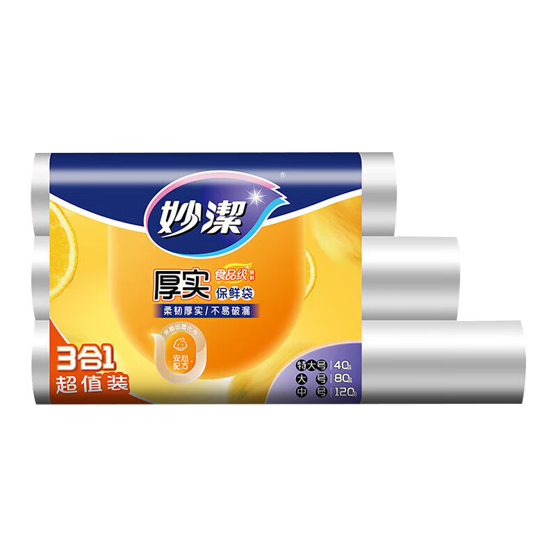 妙洁(MIAOJIE)保鲜袋 MBR3 特大号40只/卷 大号80只/卷 中号120只/卷 3卷/套 最少起订量为套(单位:套)