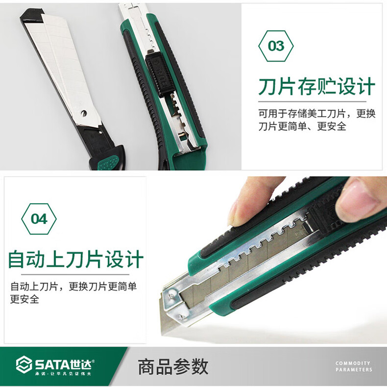 品牌:世达 (SATA) 功能:塑柄推钮美工刀 型号:93422A 规格:18*100mm