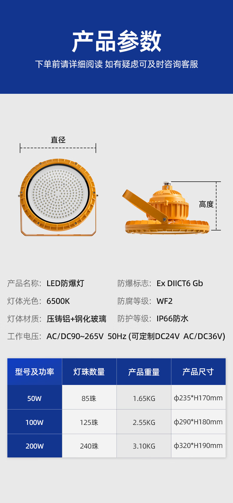 品牌:得焺 功能:LED防爆灯 型号:EX防爆认证 规格:200W 圆形款