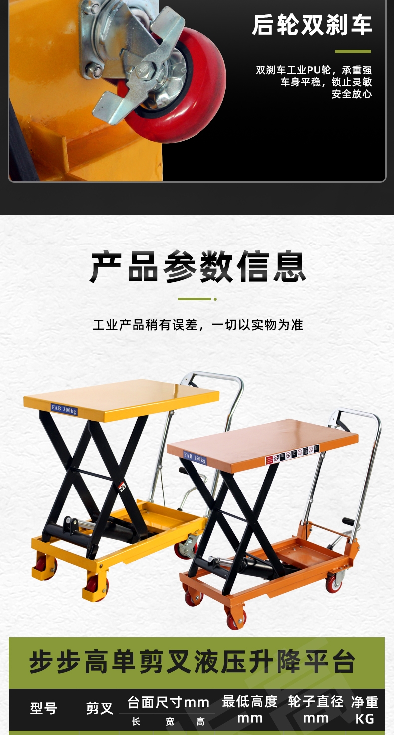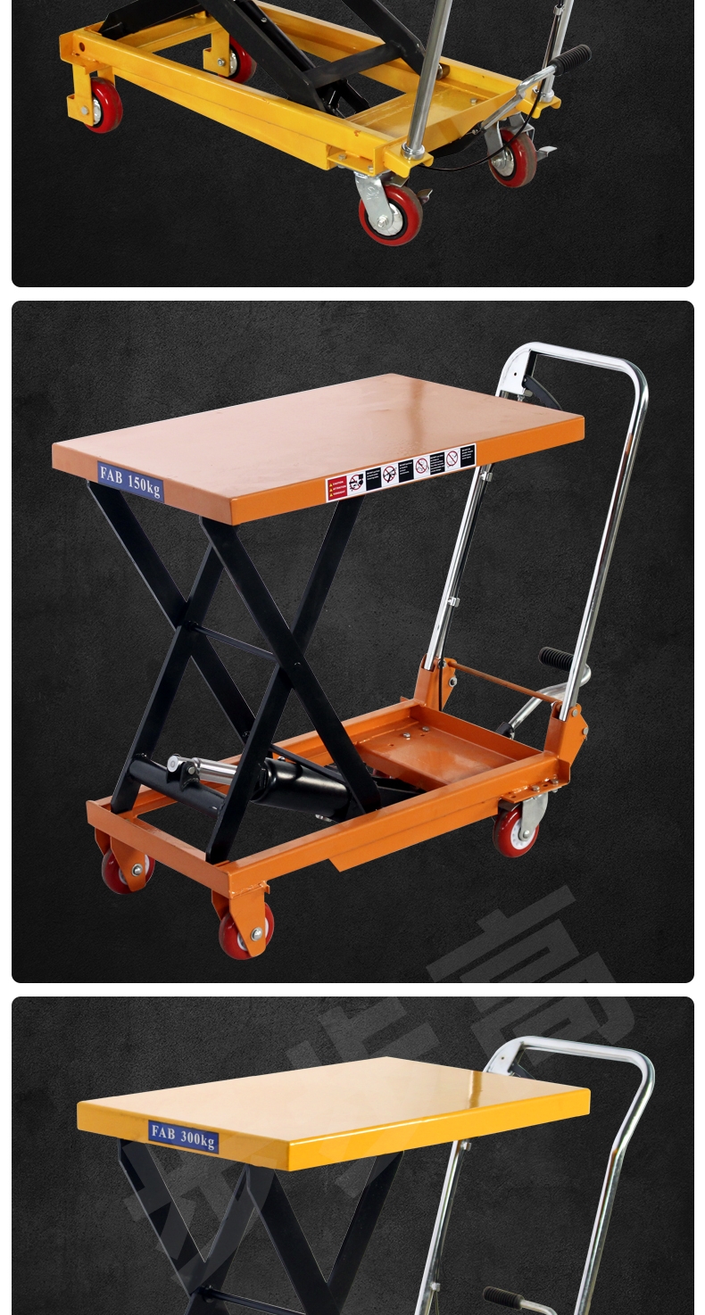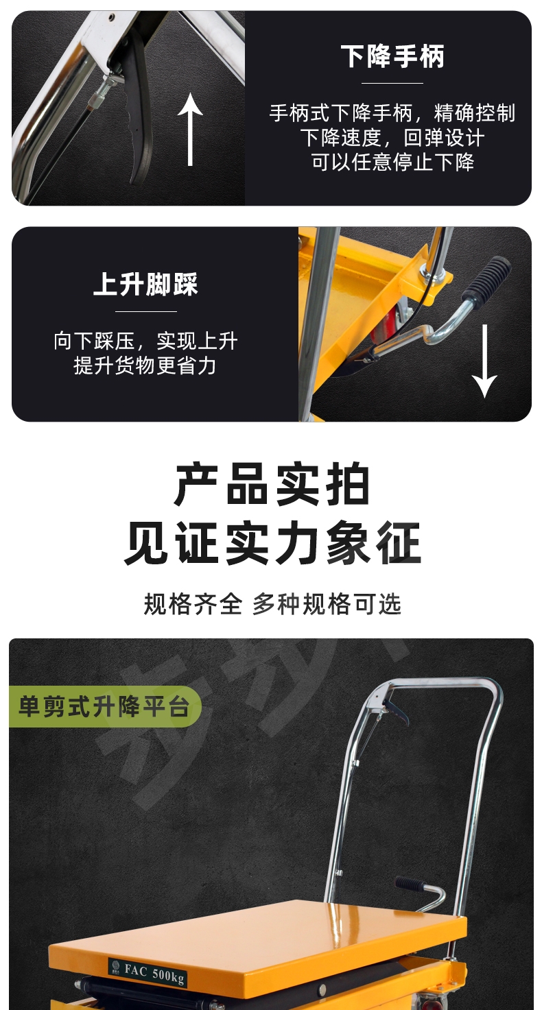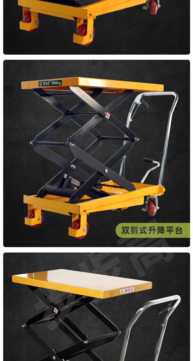 品牌:鑫成工 功能:移动式手动液压升降平台车 规格:台面尺寸905*500mm 单位:台