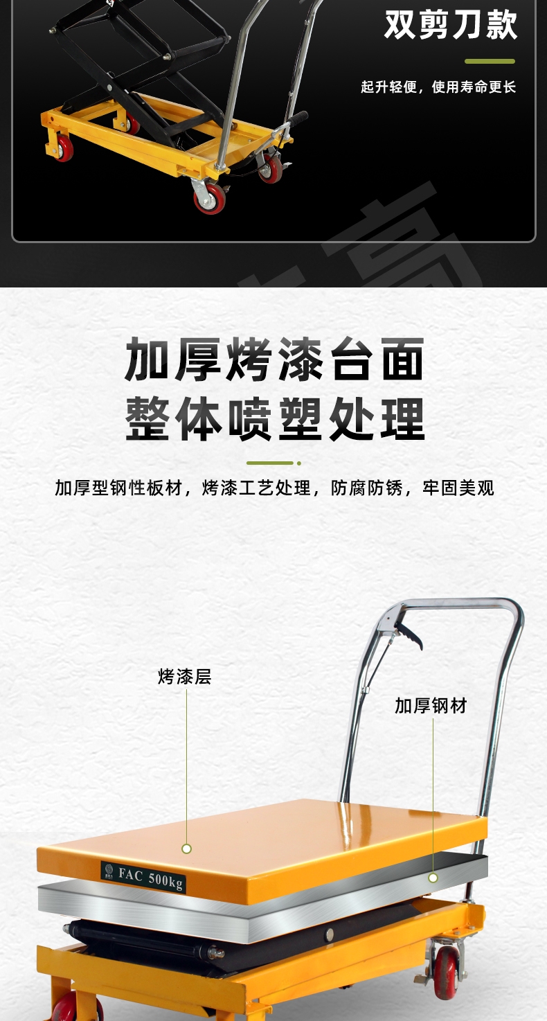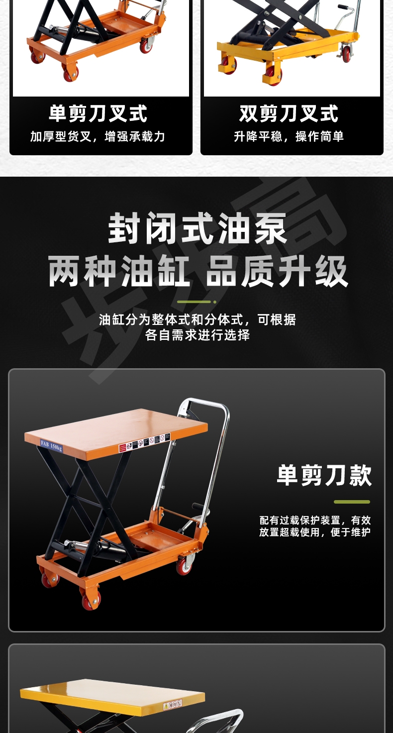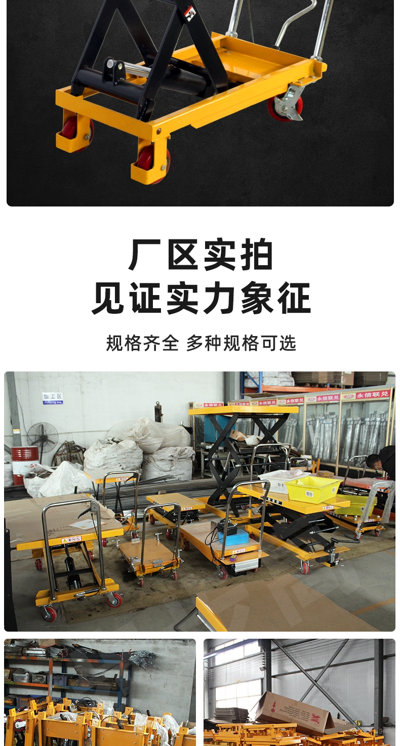 品牌:鑫成工 功能:移动式手动液压升降平台车 规格:台面尺寸905*500mm 单位:台