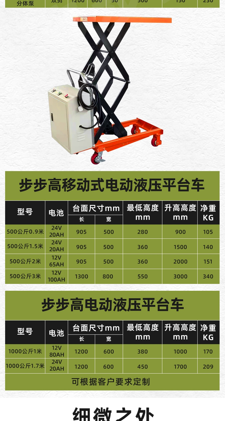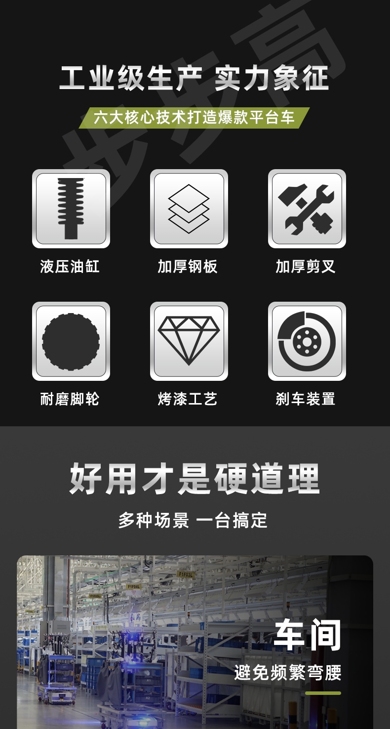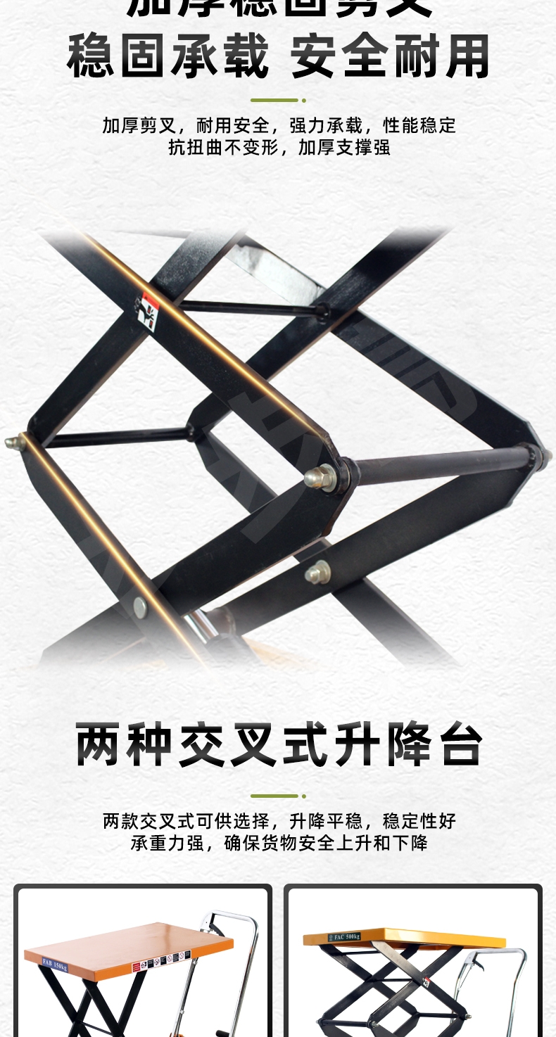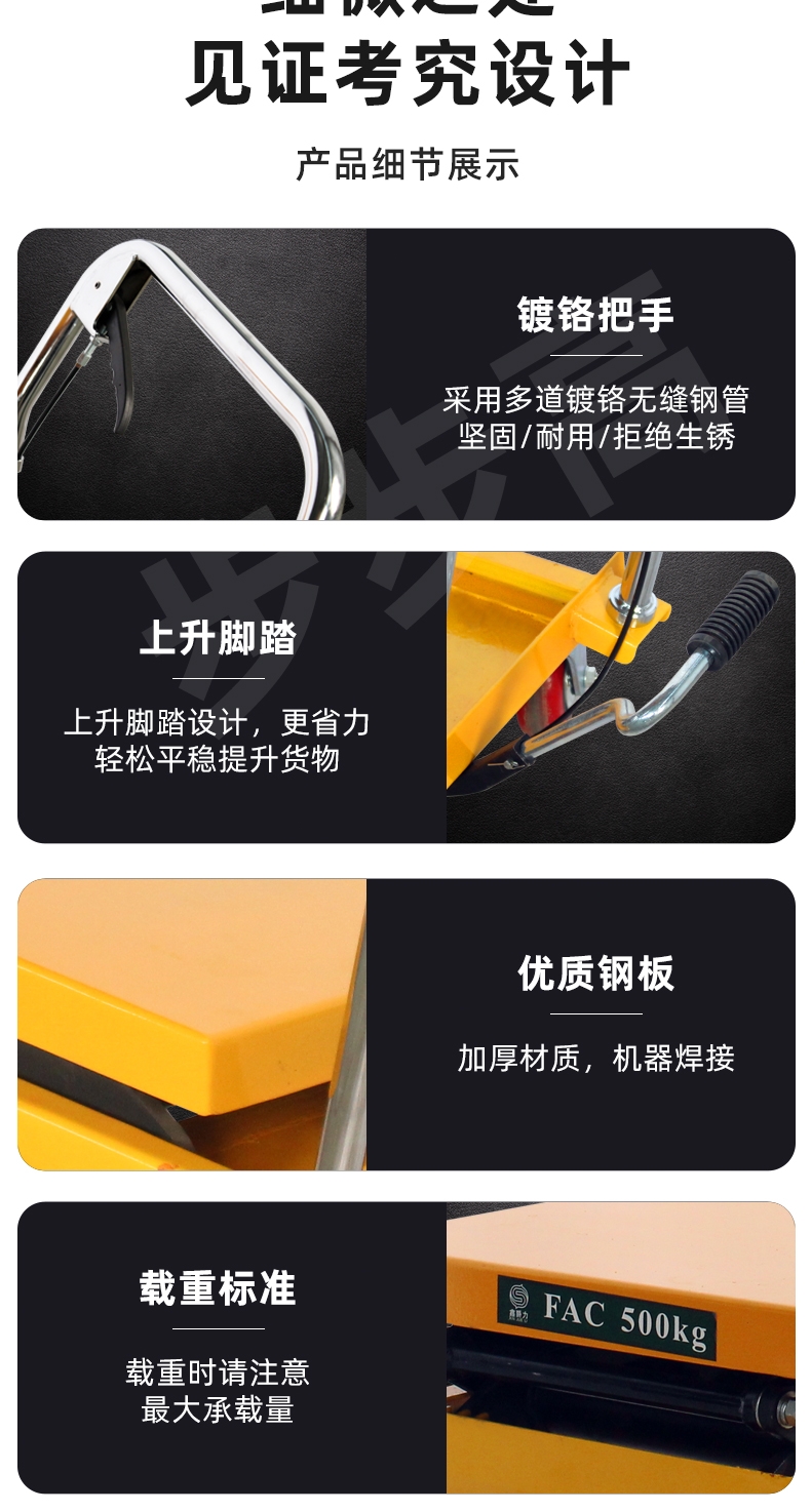 品牌:鑫成工 功能:移动式手动液压升降平台车 规格:台面尺寸905*500mm 单位:台