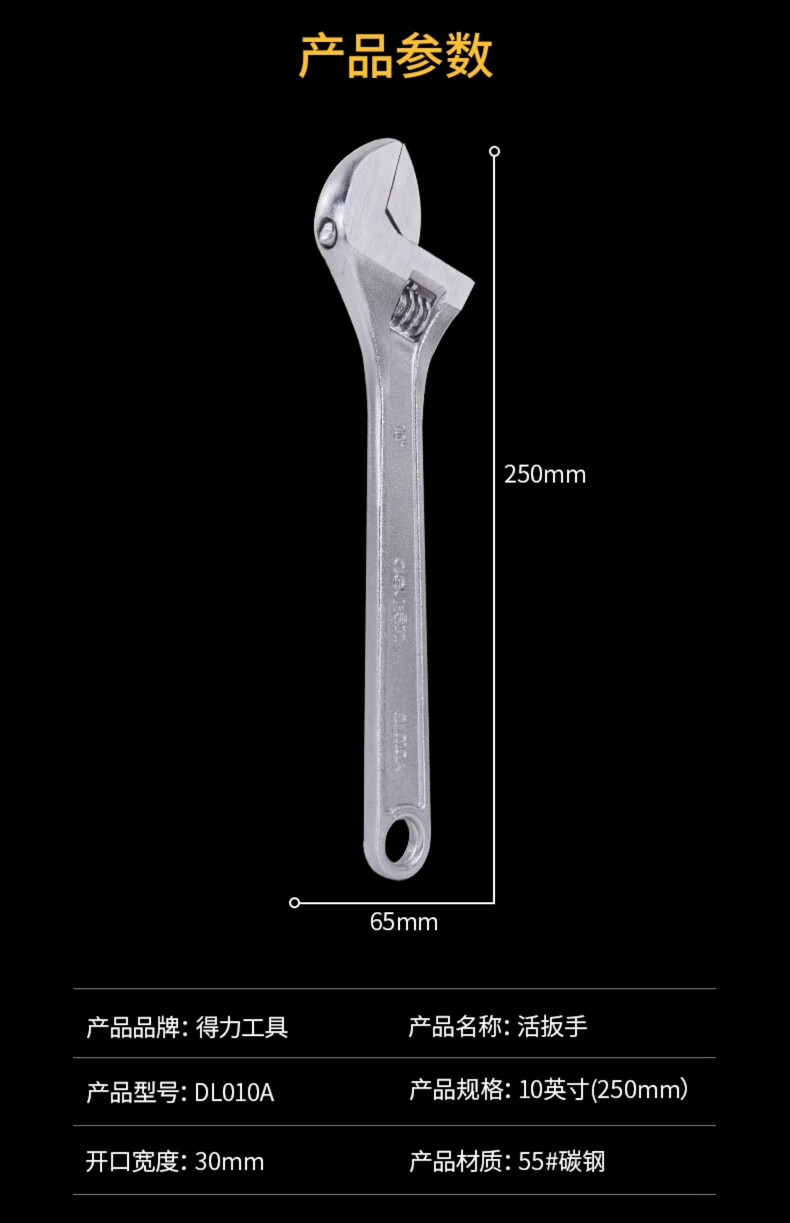 品牌:得力(deli) 功能:活动扳手 型号:DL010A 规格:10寸 250mm