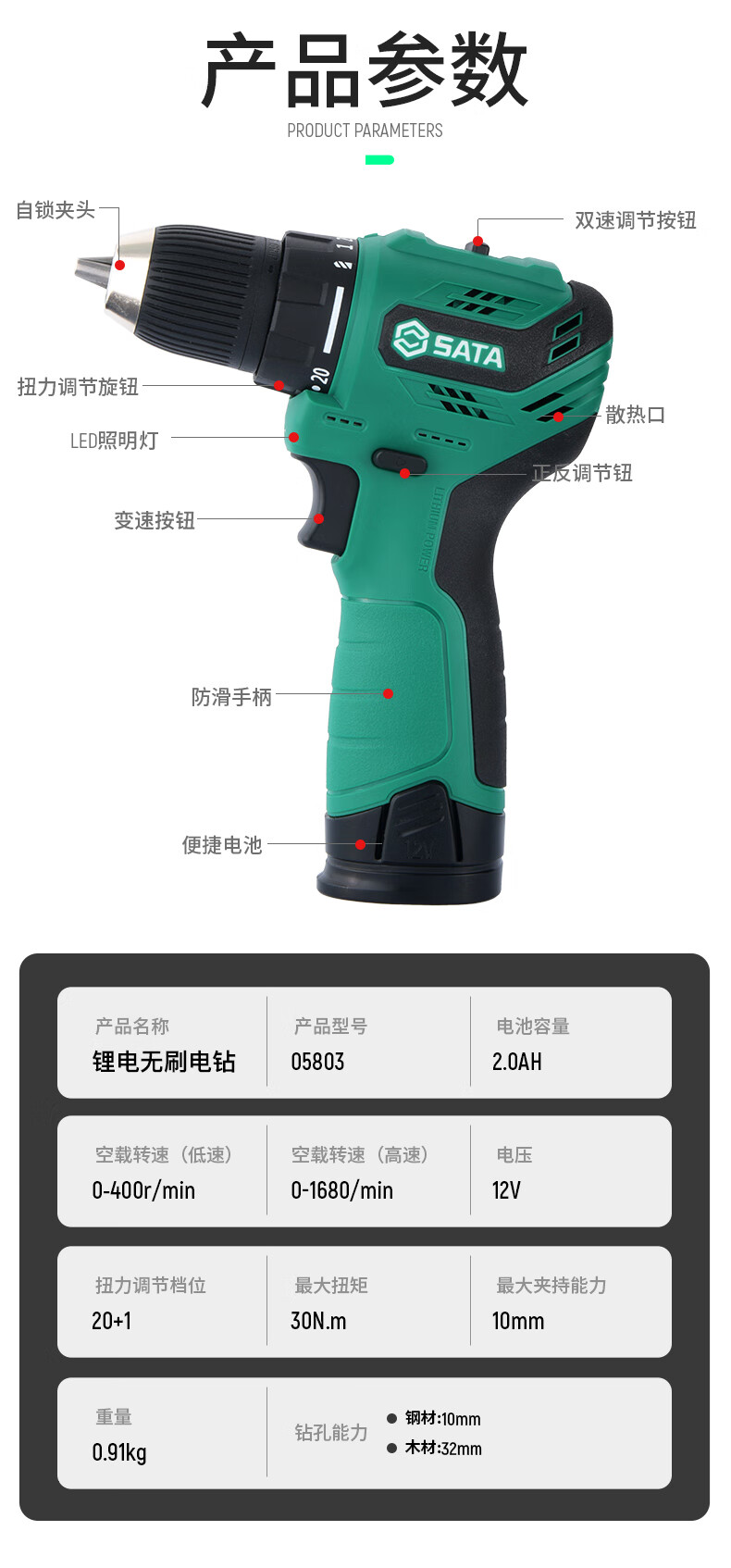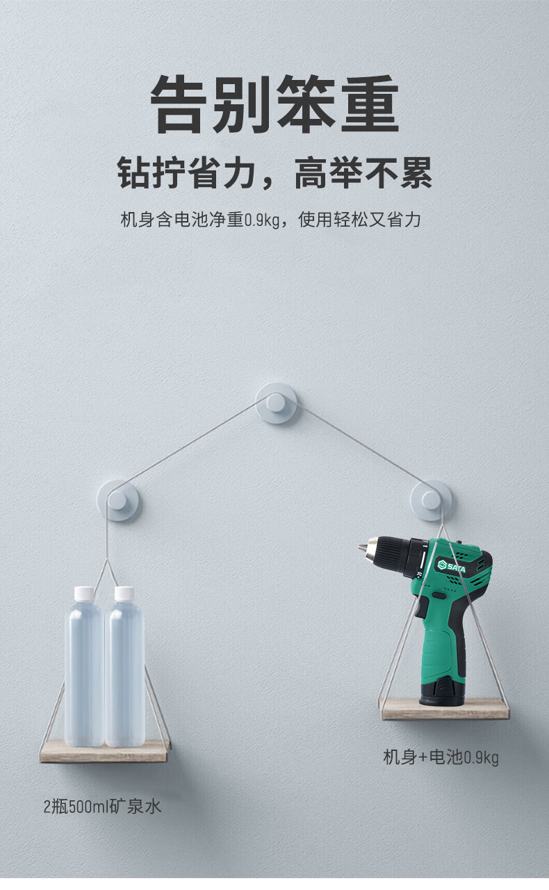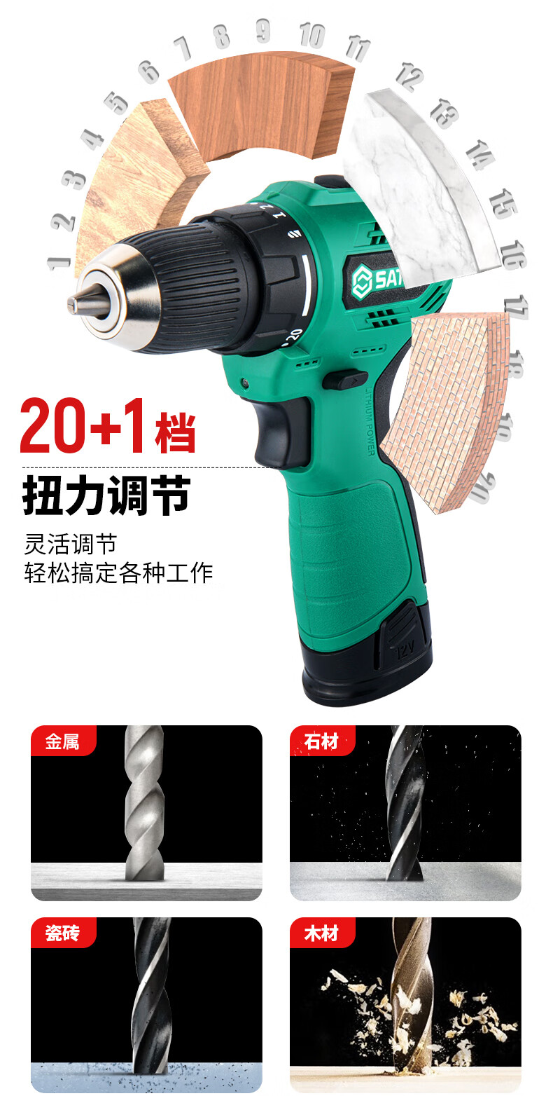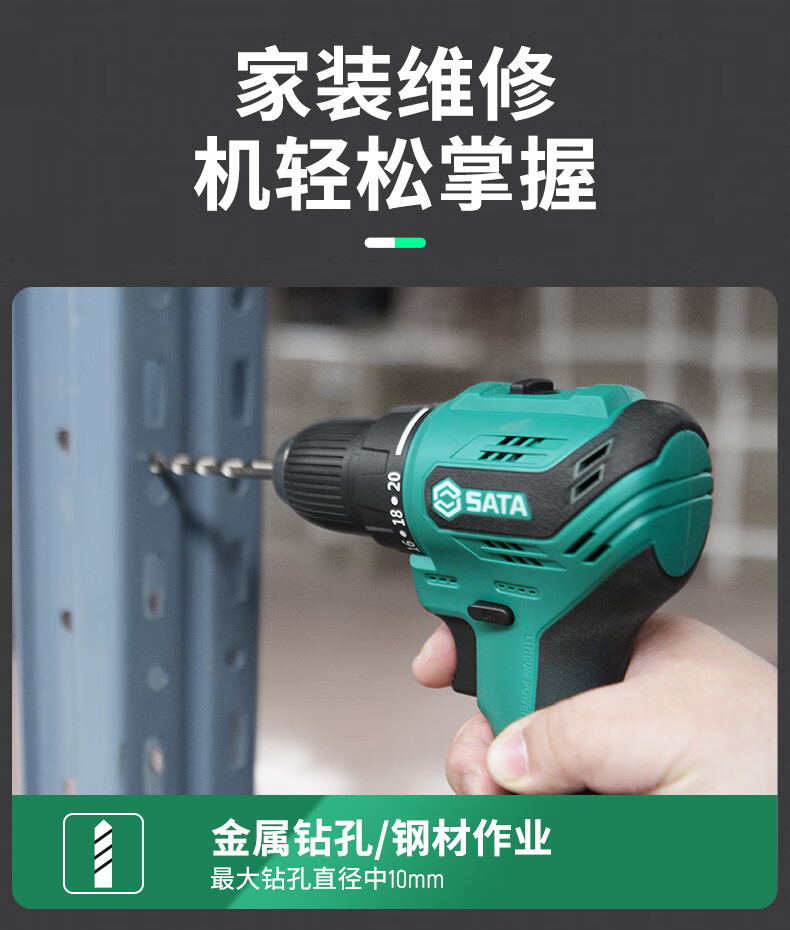 品牌:世达 (SATA) 功能:无刷锂电钻 型号:05803 规格:12V 一电一充