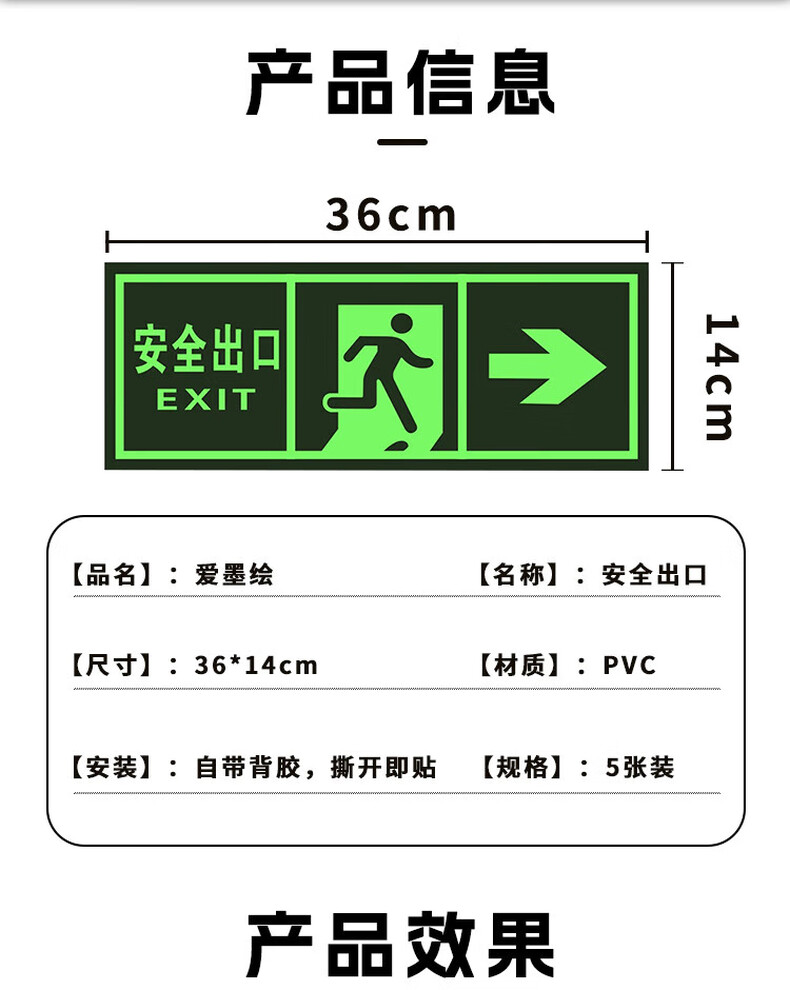 品牌:爱墨绘 功能:安全出口指示牌 型号:夜光 规格:36*14cm